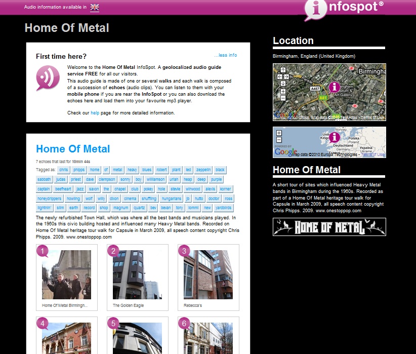 Te great thing about this is that it finds the boos by tags, so if I were to add more venues to Audioboo and tag them ‘Home Of Metal’ they would also pop up here!
